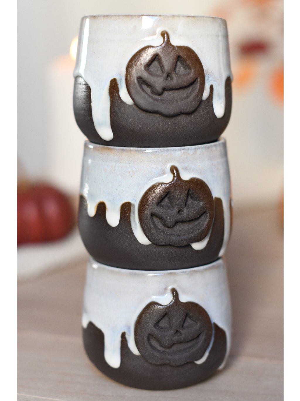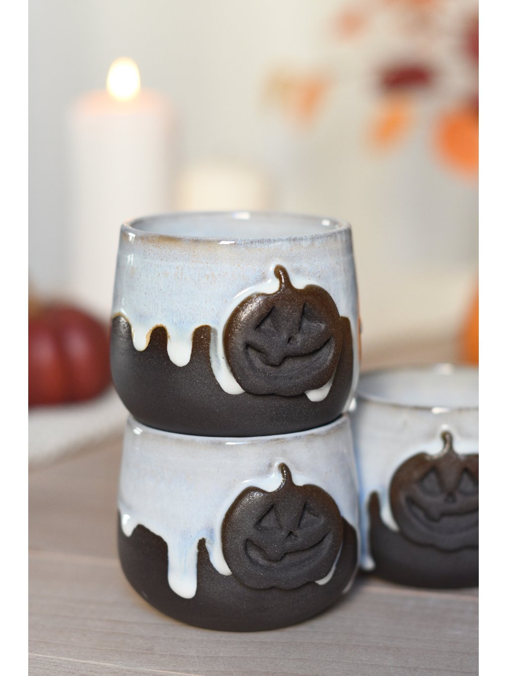 Kalíšek z černé kameniny. Modelovaná a vyřezávaná dýně. Točený na hrnčířském kruhu a pálený na vysoké teploty. Objem cca 250-270ml.