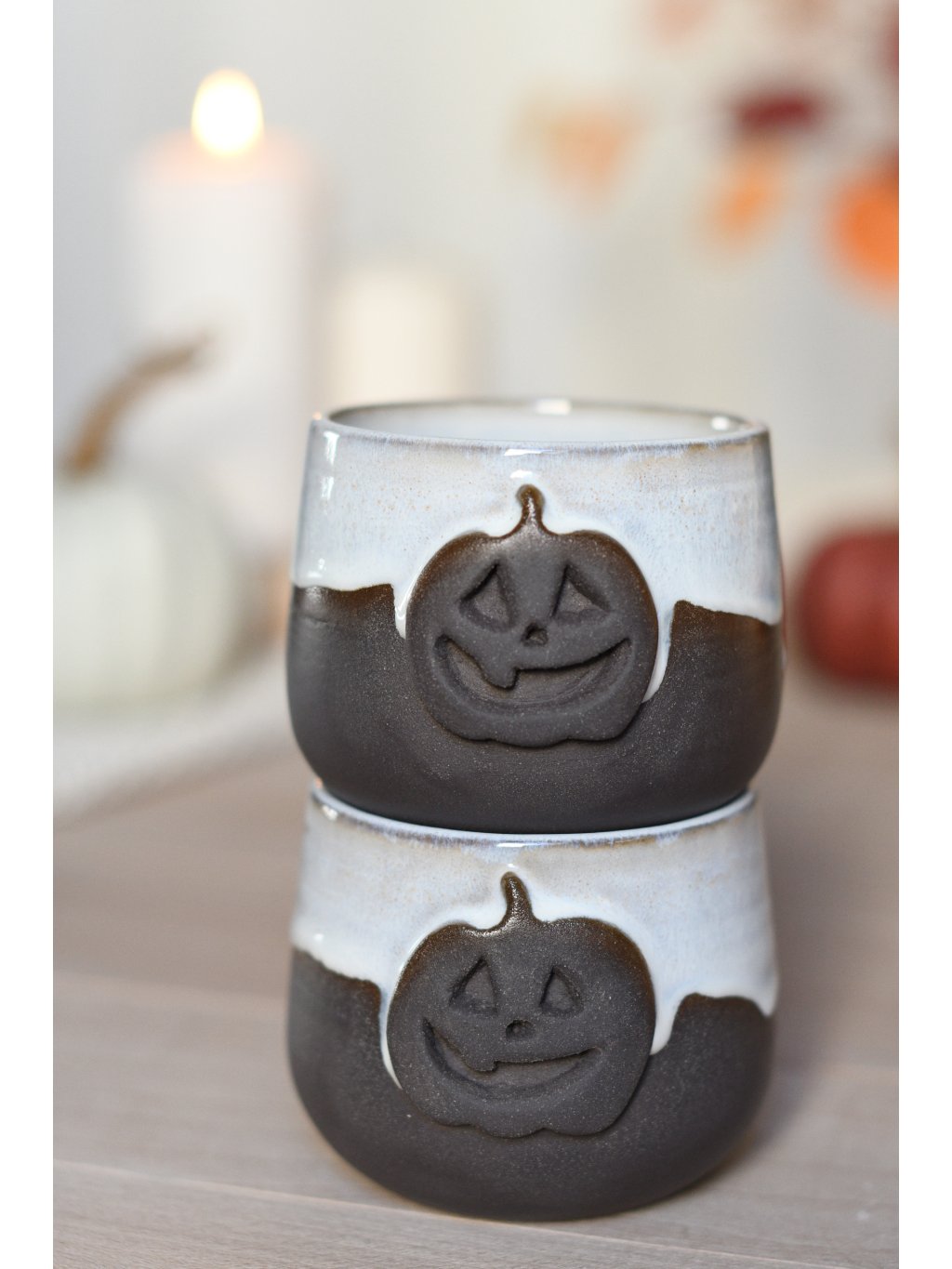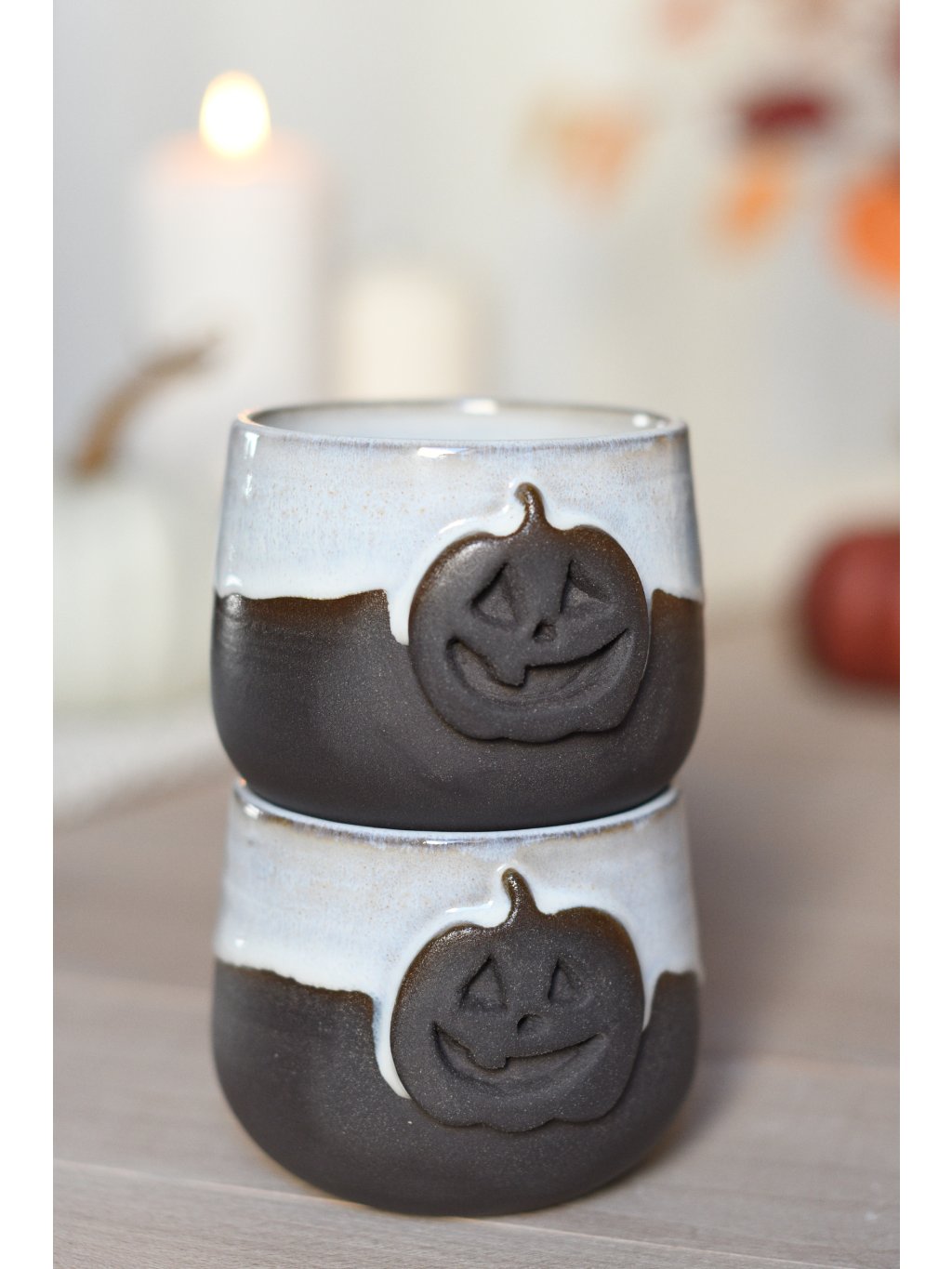 Kalíšek z černé kameniny. Modelovaná a vyřezávaná dýně. Točený na hrnčířském kruhu a pálený na vysoké teploty. Objem cca 250-270ml.