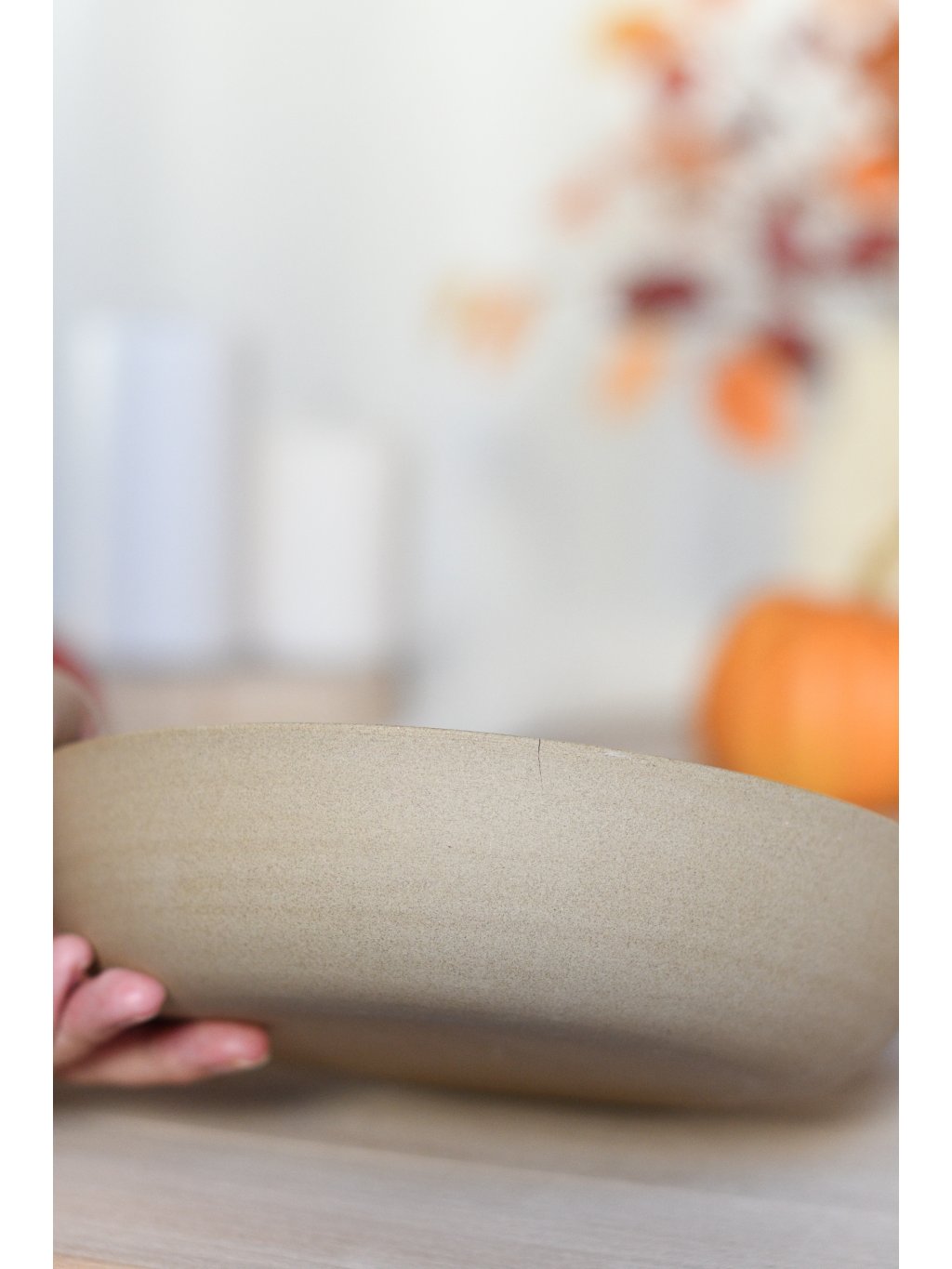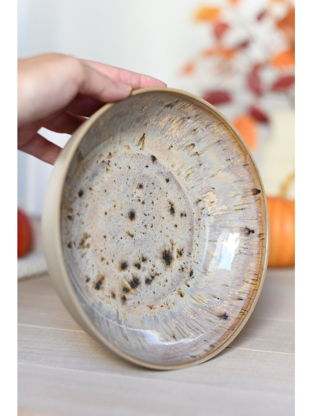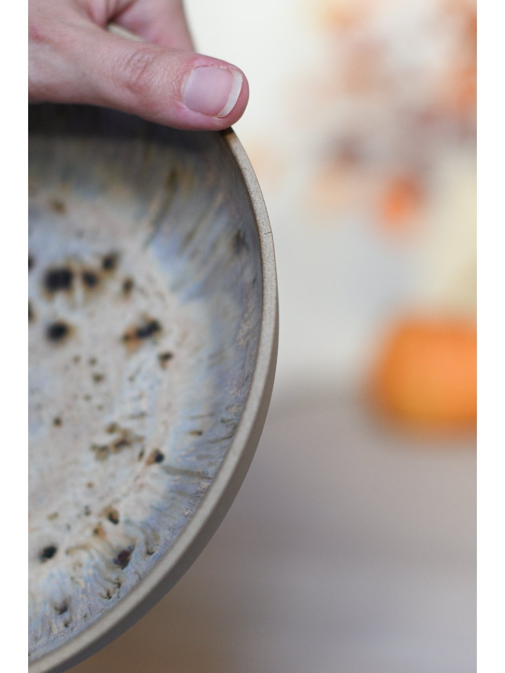 Hluboký talíř z hnědé kameniny. Točená na hrnčířském kruhu a pálená na vysoké teploty. Drobná prasklinka na okraji viz foto.