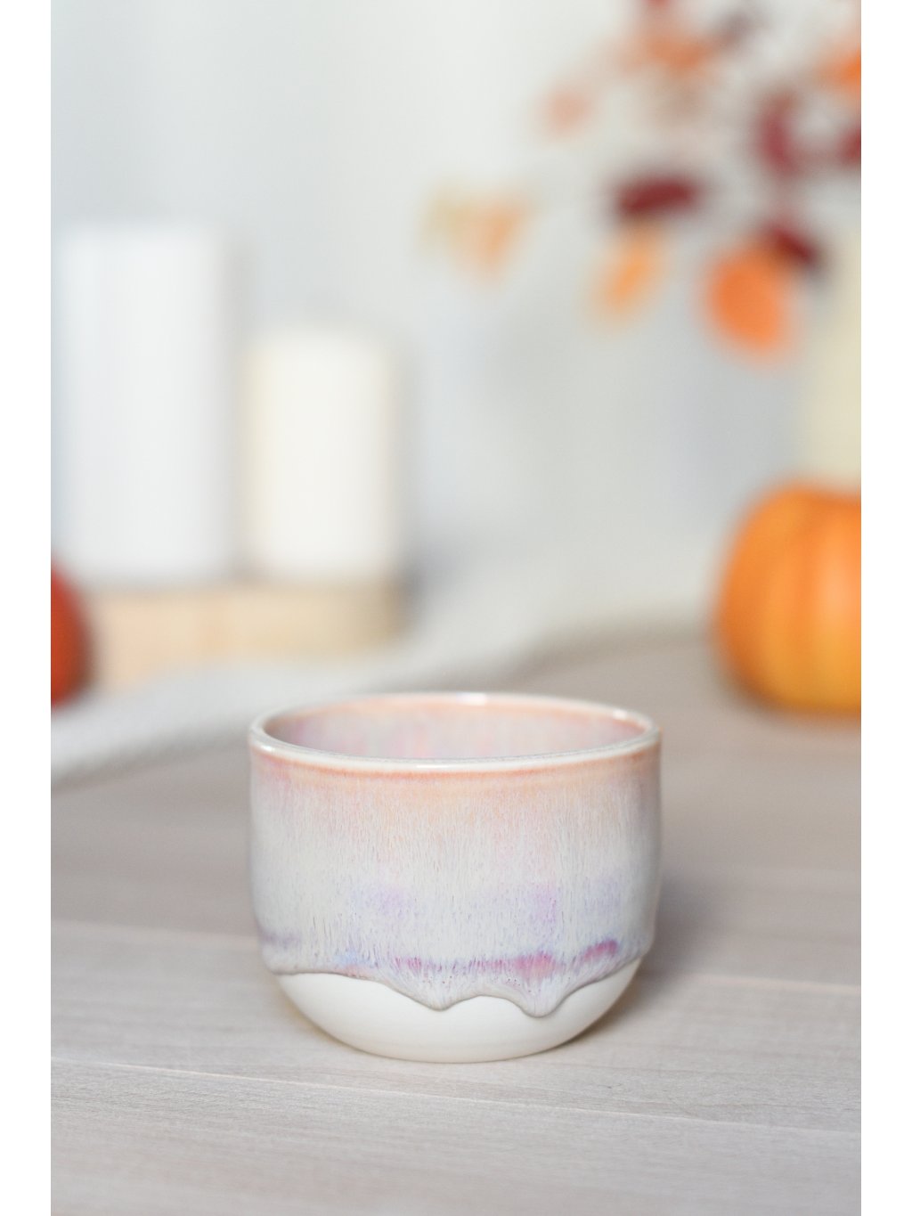 Kalíšek ze světlého porcelánu. Točený na hrnčířském kruhu a pálený na vysoké teploty. Objem cca 230-250ml. Kalíšek je lehce šišatý.
