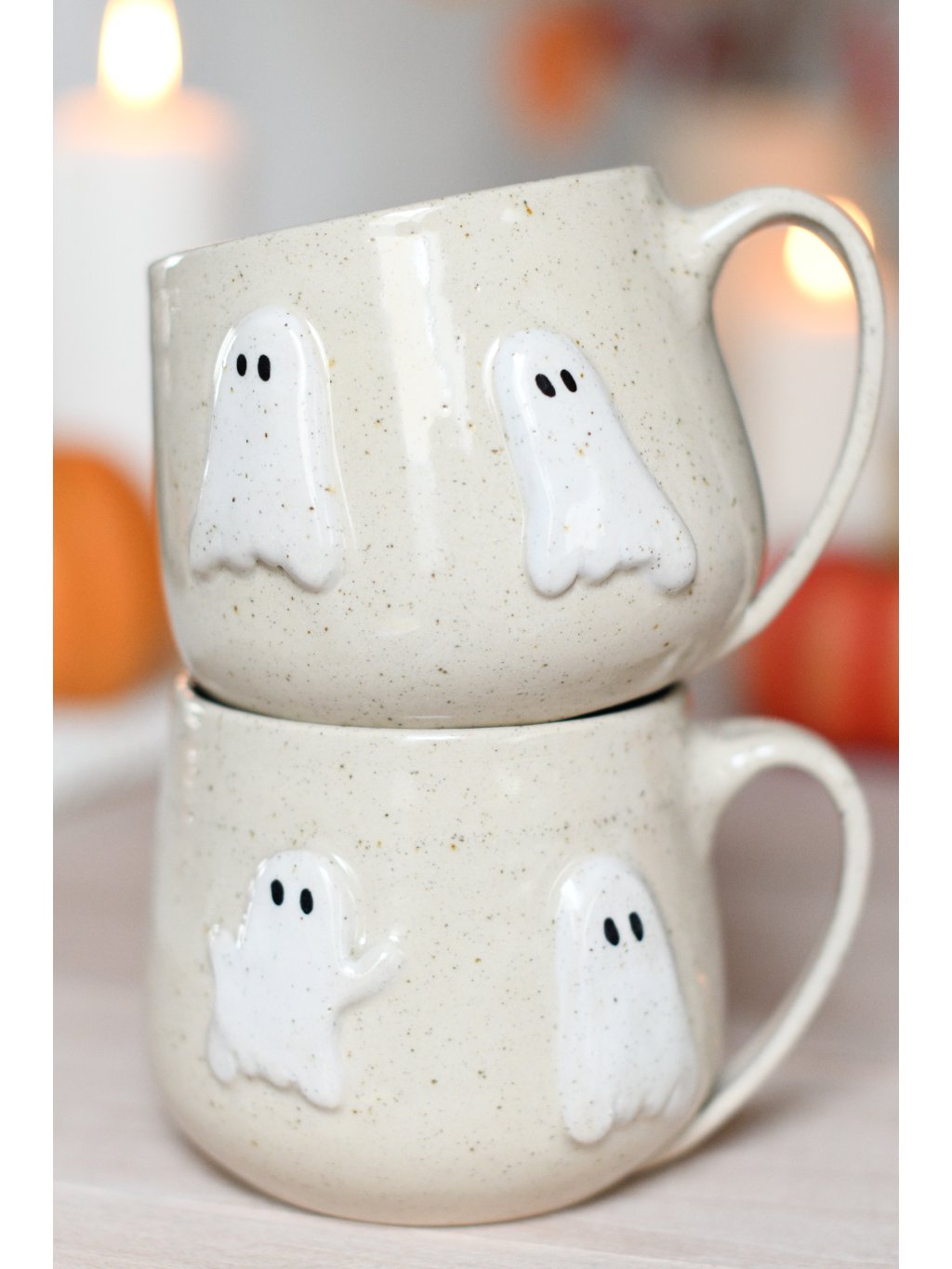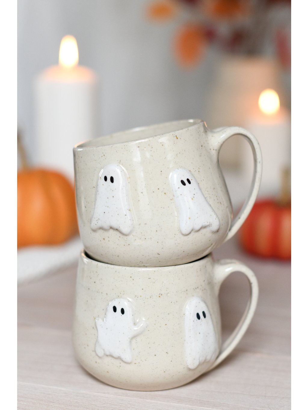 Hrnek z tečkované kameniny. Modelovaní duchové, hrnek je pokrytý transparentní glazurou. Točený na hrnčířském kruhu a pálený na vysoké teploty. Objem cca 350ml.