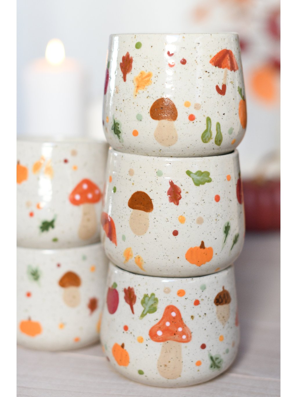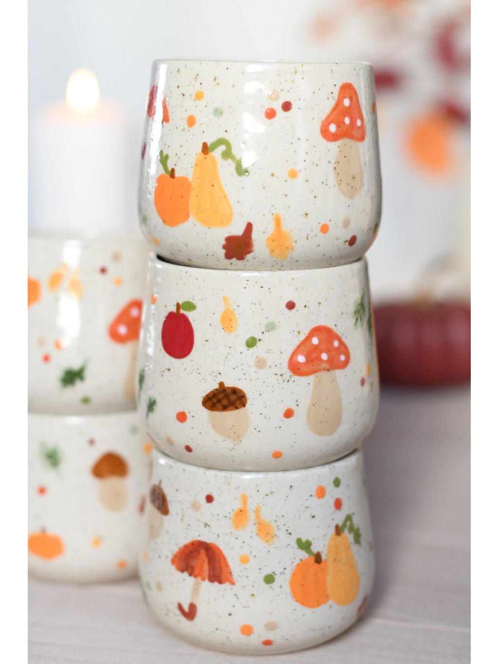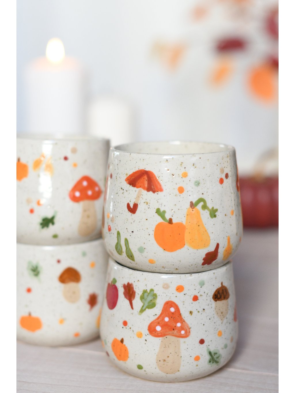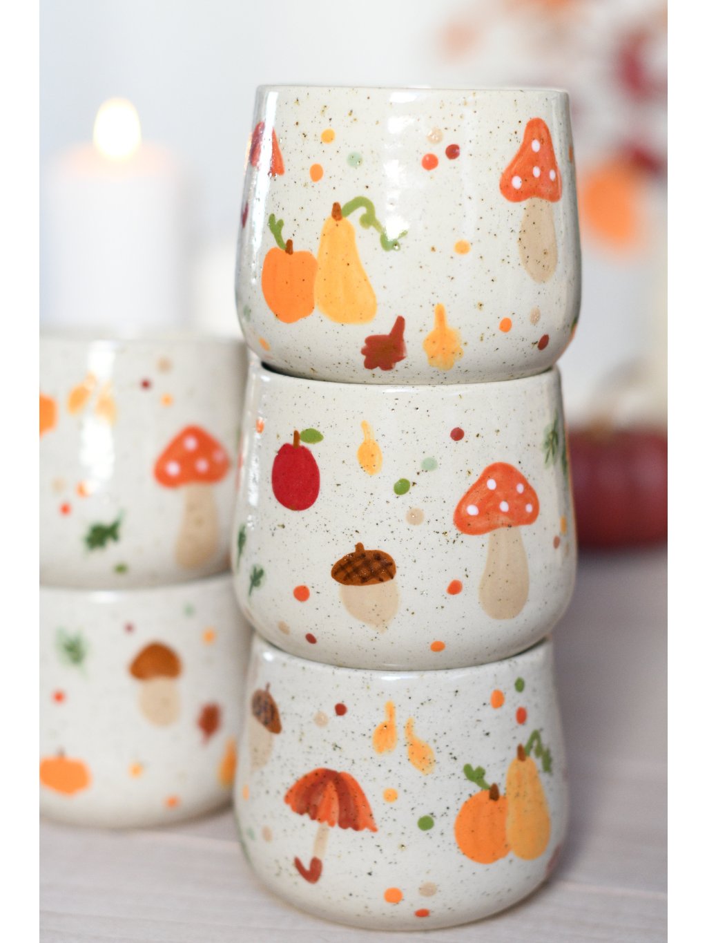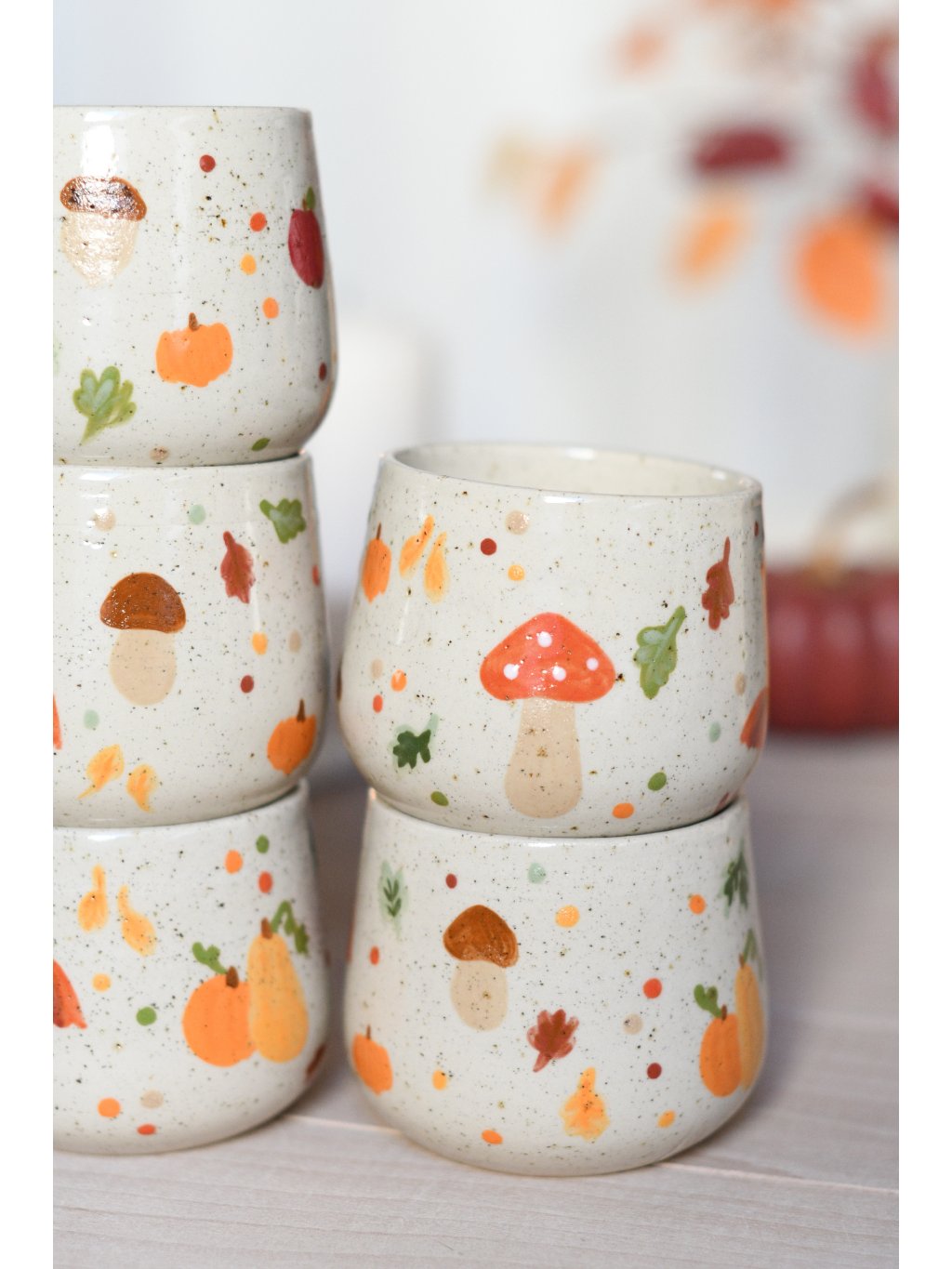 Kalíšek z tečkované kameniny. Malovaný celý kalíšek, pokrytý transparentní glazurou. Točený na hrnčířském kruhu a pálený na vysoké teploty. Objem cca 250-270ml.