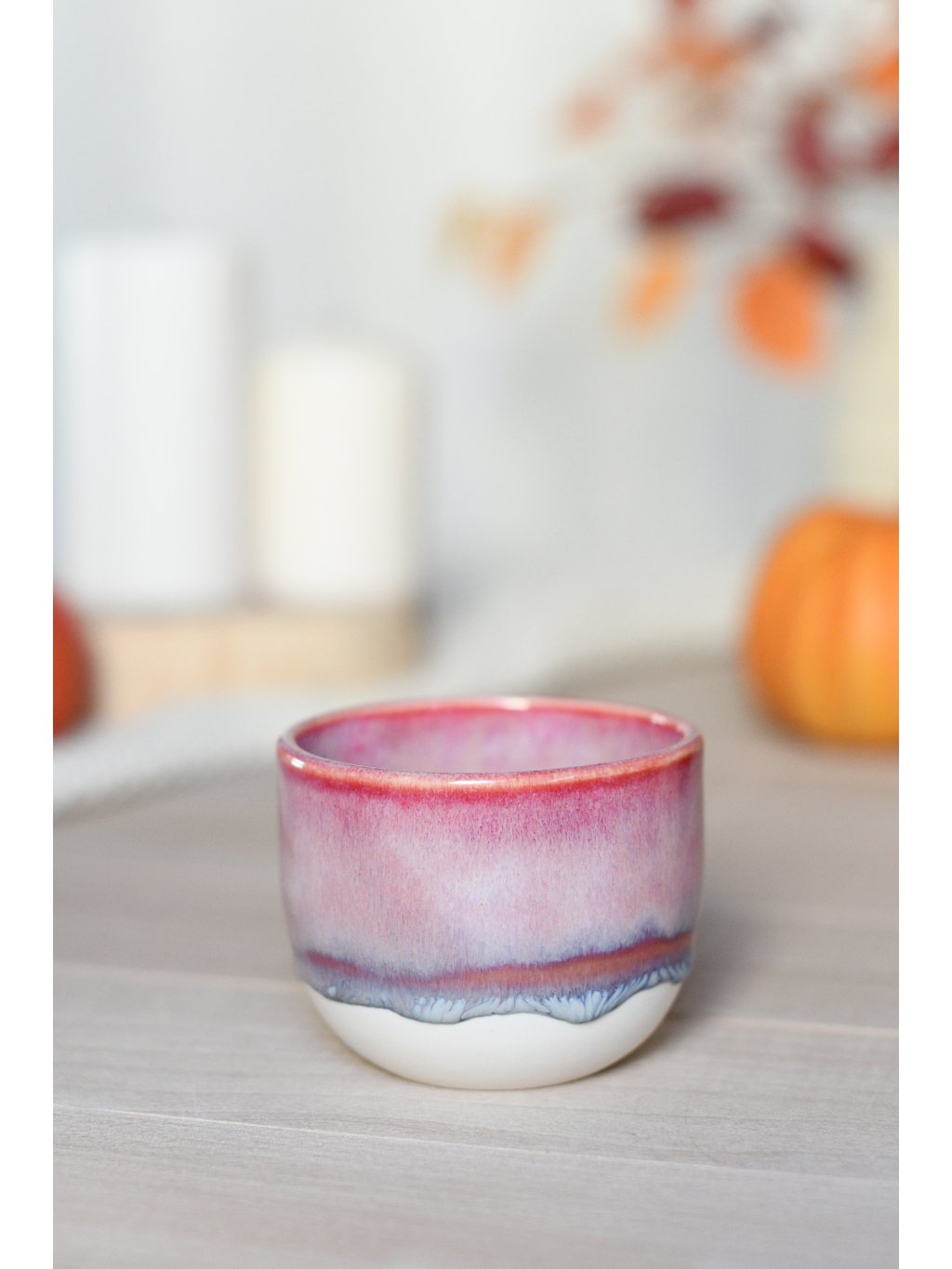 Kalíšek ze světlého porcelánu. Točený na hrnčířském kruhu a pálený na vysoké teploty. Objem cca 230-250ml. Kalíšek má lehce šišatý tvar.