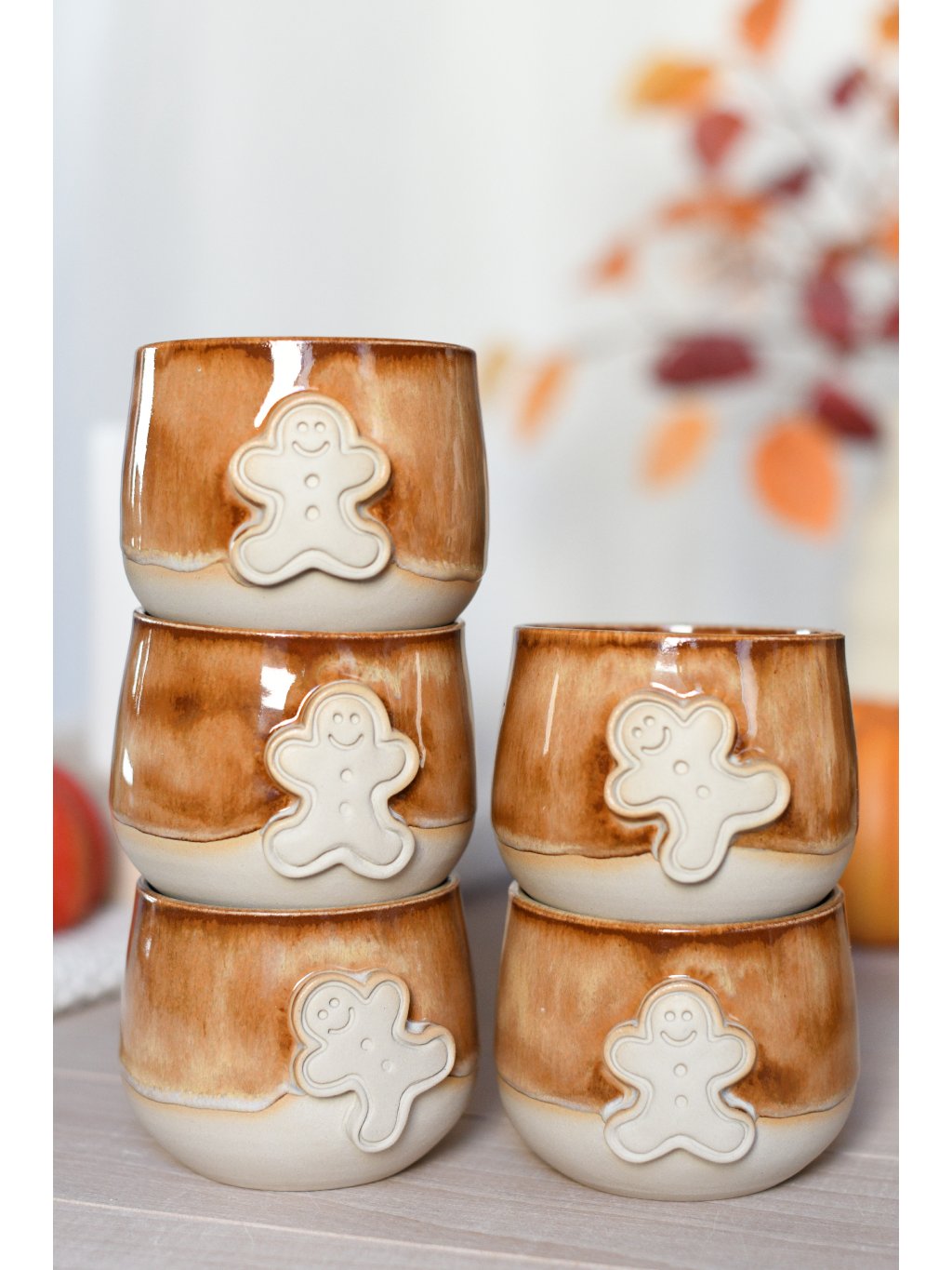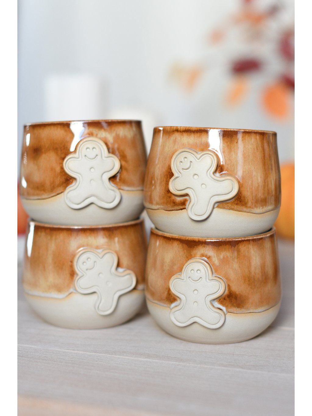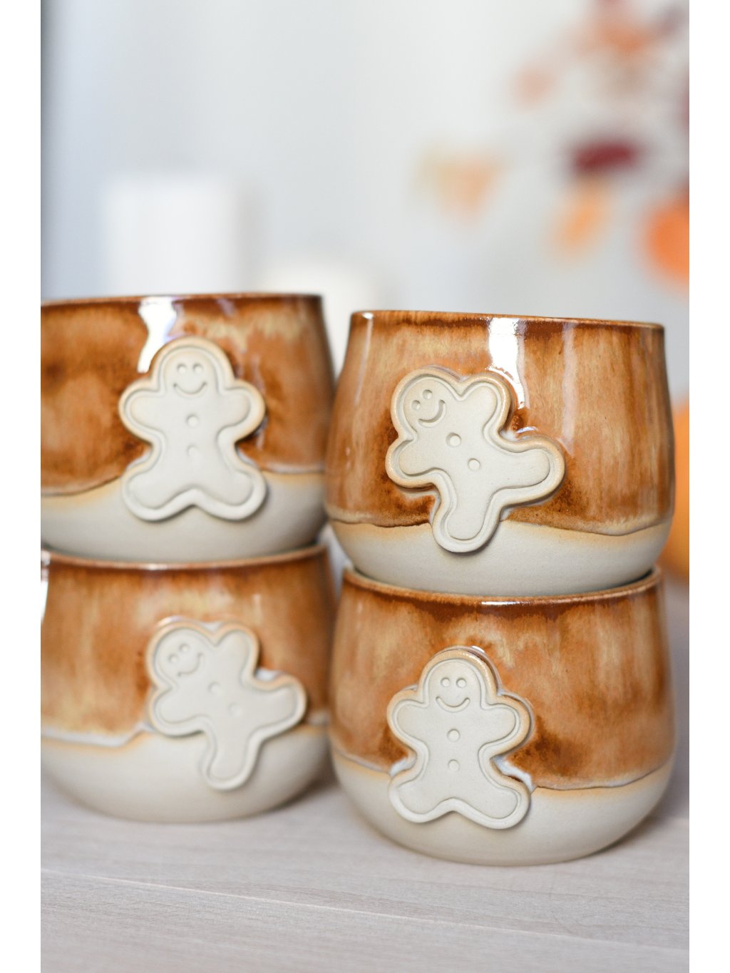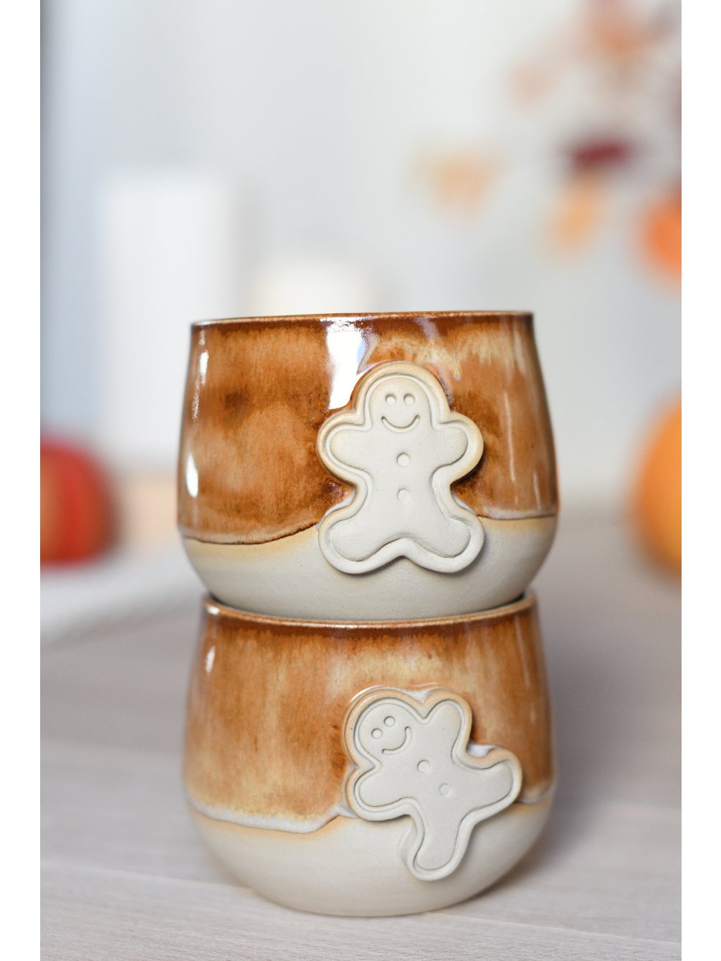 Kalíšek z bílé kameniny. Točený na hrnčířském kruhu a pálený na vysoké teploty. Objem cca 280ml. Kalíšky jsou mírně šišaté a kolem perníčků se můžou objevit mini prasklinky.