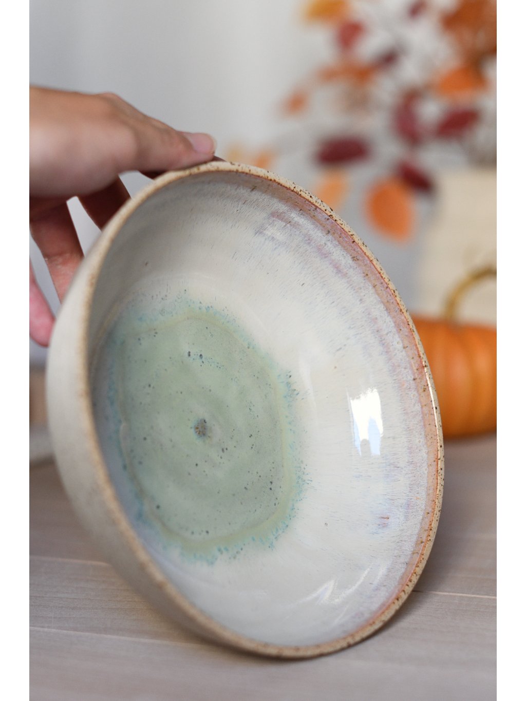 Hluboký talíř z pigmentové kameniny. Točený na hrnčířském kruhu a pálený na vysoké teploty. Drobné bublinky v glazuře, které byly následně zabroušeny.