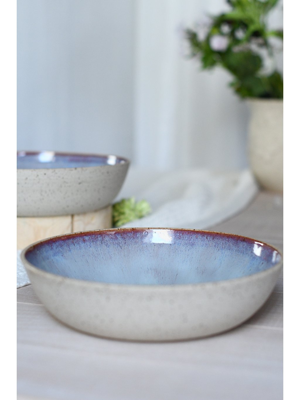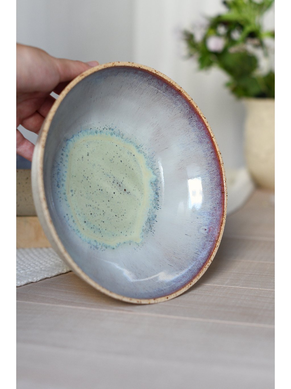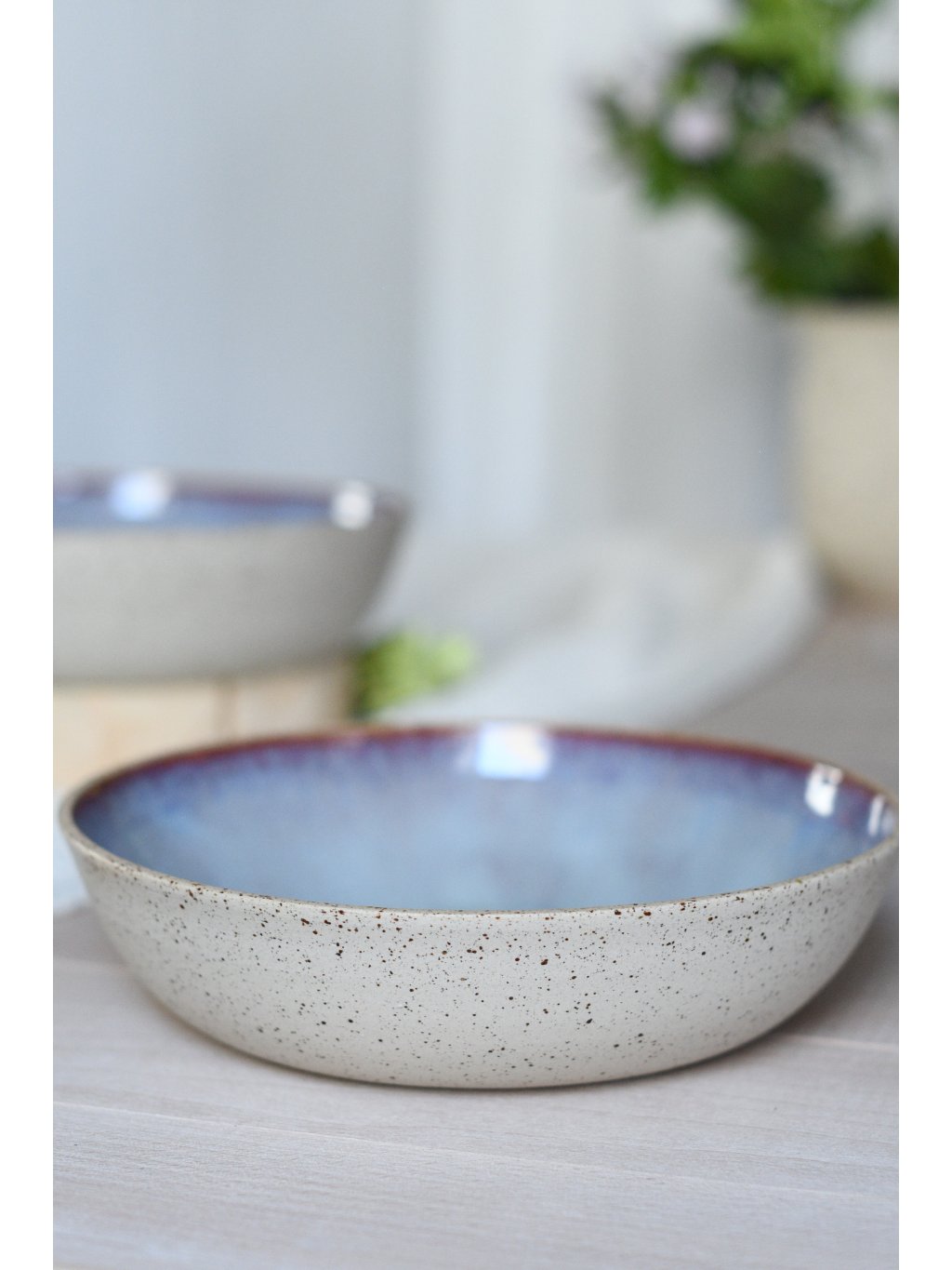 Hluboký talíř z tečkované kameniny. Točený na hrnčířském kruhu a pálený na vysoké teploty.