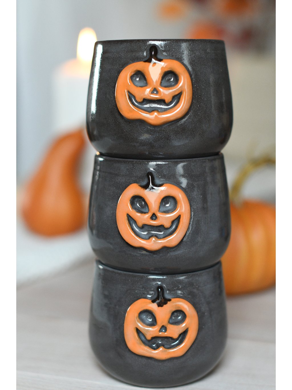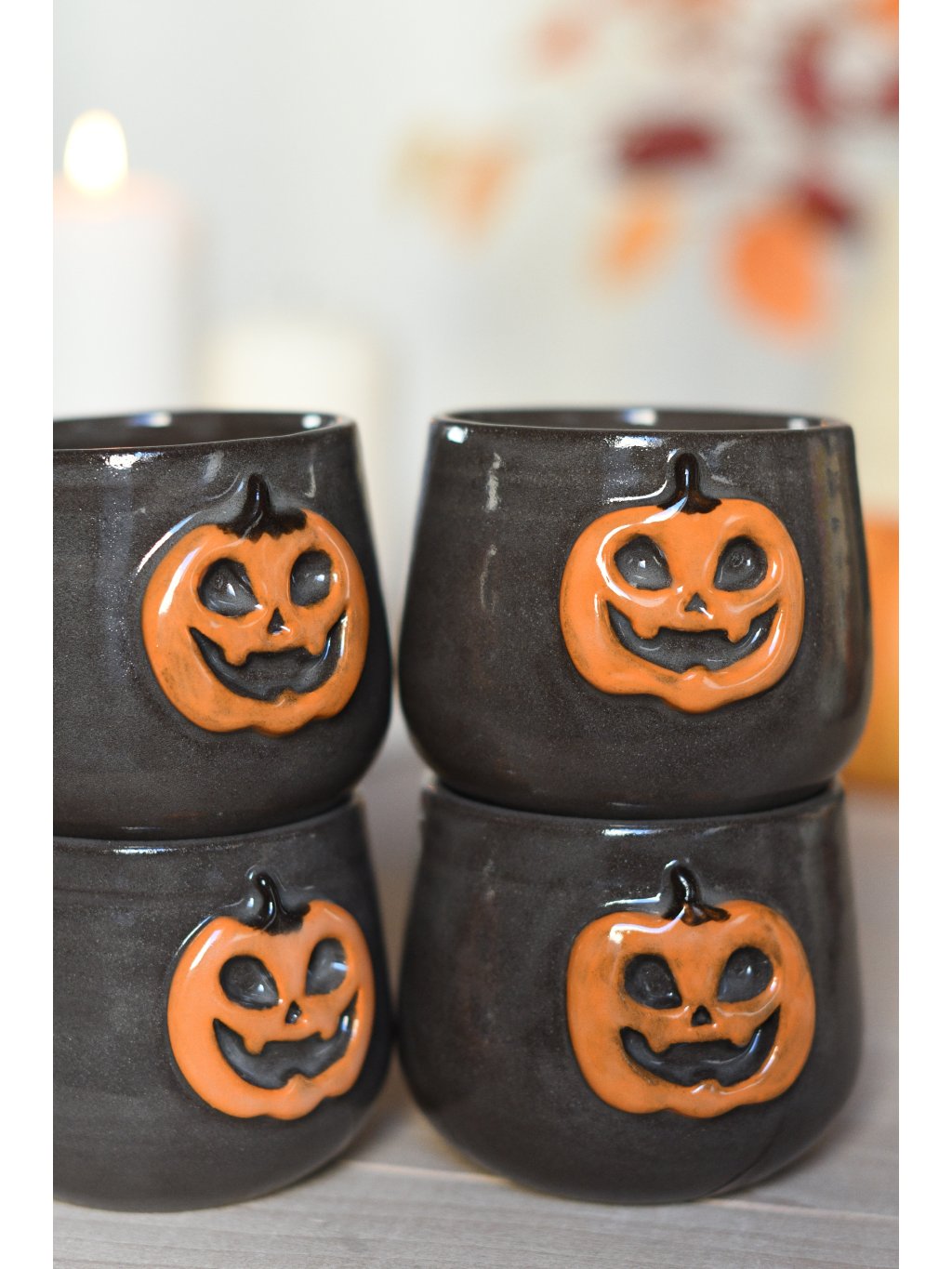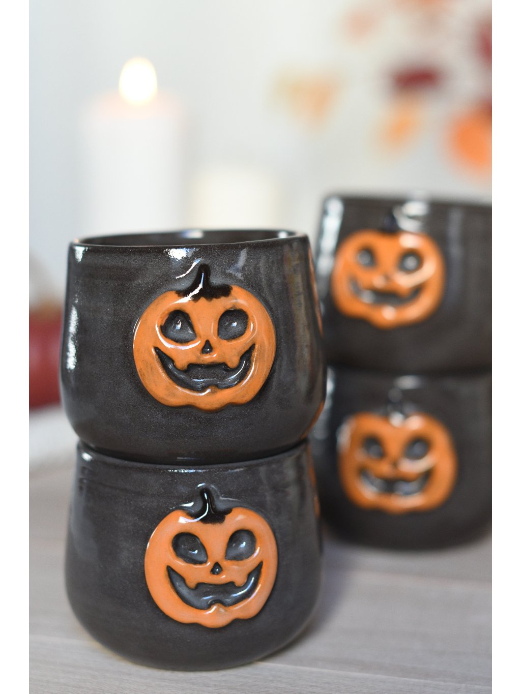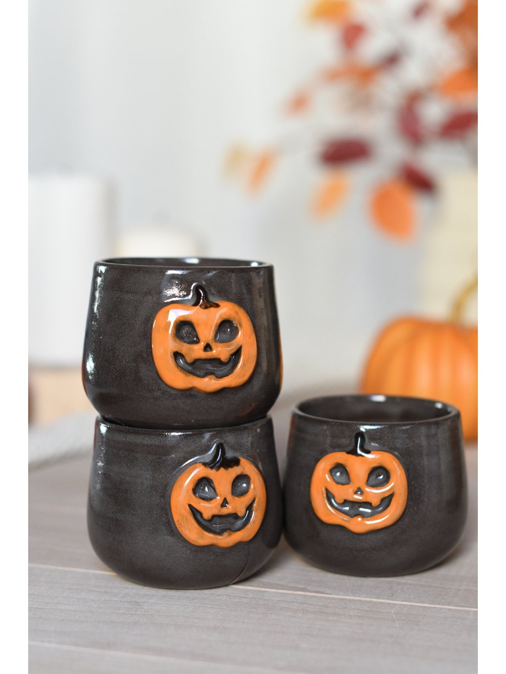 Kalíšek z černé kameniny. Modelovaná a vyřezávaná dýně, kalíšek je pokrytý transparentní glazurou. Točený na hrnčířském kruhu a pálený na vysoké teploty. Objem cca 270ml.
