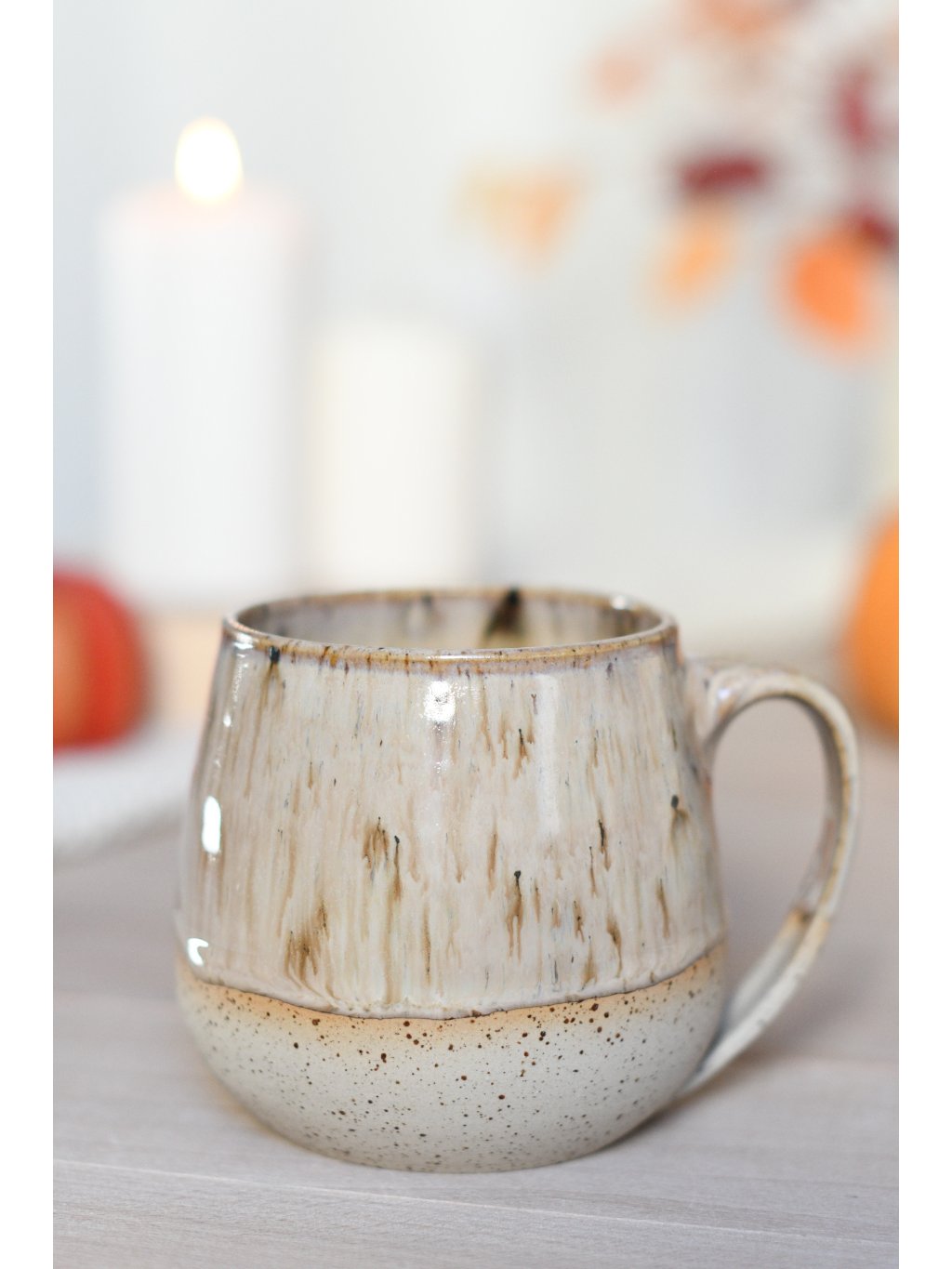 Hrnek z tečkované kameniny. Točený na hrnčířském kruhu a pálený na vysoké teploty. Objem cca 500ml. Starší tvar, lehce šišatý.